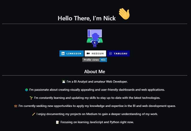 Next, add badges for your social media profiles using the following HTML code, I choose to showcase my Tableau Public profile, LinkedIn, and Medium from shields.io. Shields.io has many logos, just copy and paste the corresponding link: