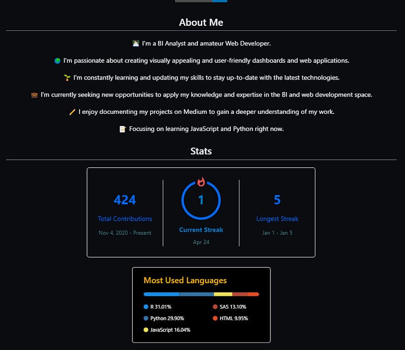 <div id="bio"> <h2>About Me</h2> <ul> <li>I'm a [your job title] and [your interests/hobbies]</li> <li>I'm passionate about [what you're passionate about]</li> <li>I'm constantly learning and updating my skills to stay up-to-date with the latest technologies.</li> <li>I'm currently seeking new opportunities to apply my knowledge and expertise in the [your field] space.</li> <li>I enjoy documenting my projects on Medium to gain a deeper understanding of my work.</li> <li>Focusing on learning [languages or technologies you're currently studying] right now.</li> </ul></div>