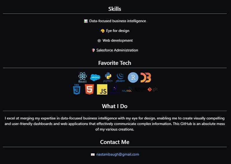 I think you get the gist of it now! With a little bit of HTML, we can spruce up our GitHub README greatly.