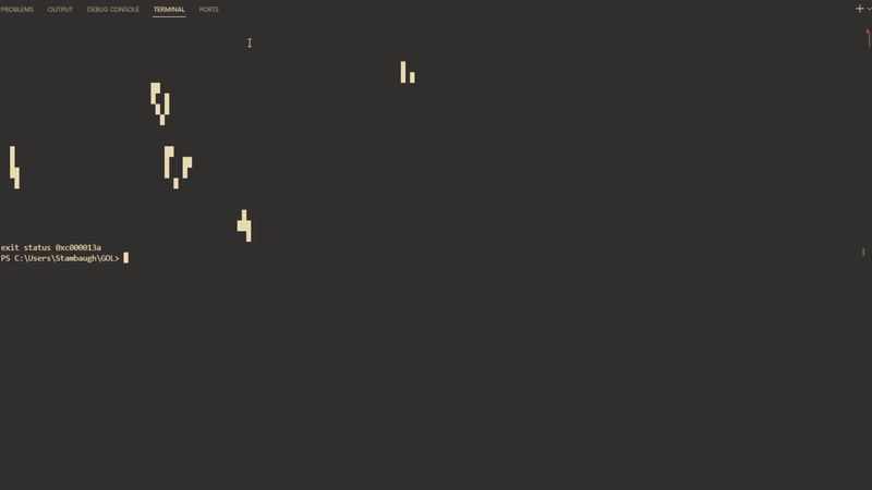 This loop continues indefinitely, creating an animated display of the Game of Life simulation in the terminal window.